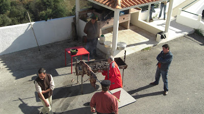 O trabalho de assar o porco esteve como sempre ao cuidado dos especialistas, neste caso e que por acaso costumam participar quase sempre nesta tarefa foram o Álvaro e o Abel na parte de ir talhando o porco que ia sendo assado e o Ti Carlos e o Zé Luis foram ajudando na fogueira e a rodar o porco no espeto. O Ti Jerónimo esteve no controlo das operações a coordenar e a verificar se estava tudo a seguir as normas.